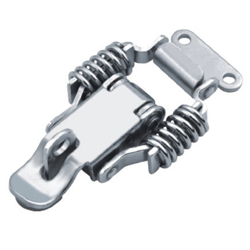 弹簧搭扣具有体积小,不占空间的特点,可以快速扣紧和松开功能。两侧弹簧具有迫紧功能,可以使物件保持迫紧的状态。弹簧搭扣通常采用两种材料,304不锈钢或者铁镀铬或者镀锌镀镍。这两种材质是在工业生产中使用最为广泛和普及的材质。其良好的韧性和超强的耐腐蚀性能是其应用广泛的最主要原因。弹簧搭扣一般采用冲压成型,采用不锈钢材料则是用不锈钢钢板冲压成型,不锈钢钢板的常规厚度为1mm,2mm,3mm.不锈钢无论是在室内室外使用弹簧搭扣都可以保持良好的本质特征——耐腐蚀不生锈。一般也不用做加材料形式的表面处理,而是振动抛光和镜面抛光等。客户也可以要求使用铁镀铬,虽然在价格上比不锈钢稍低一些但是防腐蚀功能没有不锈钢好,请客户斟酌再三。